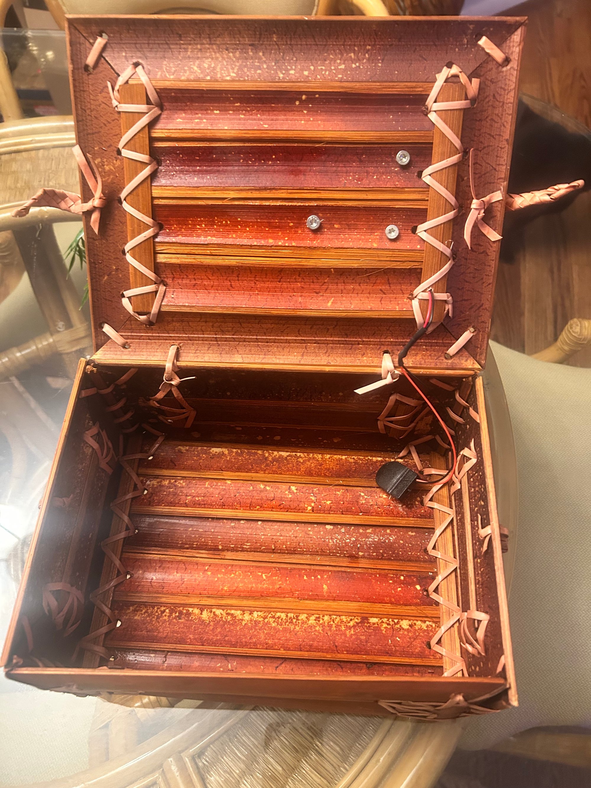 Hand-laced wood box measuring about 10 inches wide, 7 inches in depth, and 5 inches in height. Kong hand is about 7 inches in height to bring total height to 12 inches.