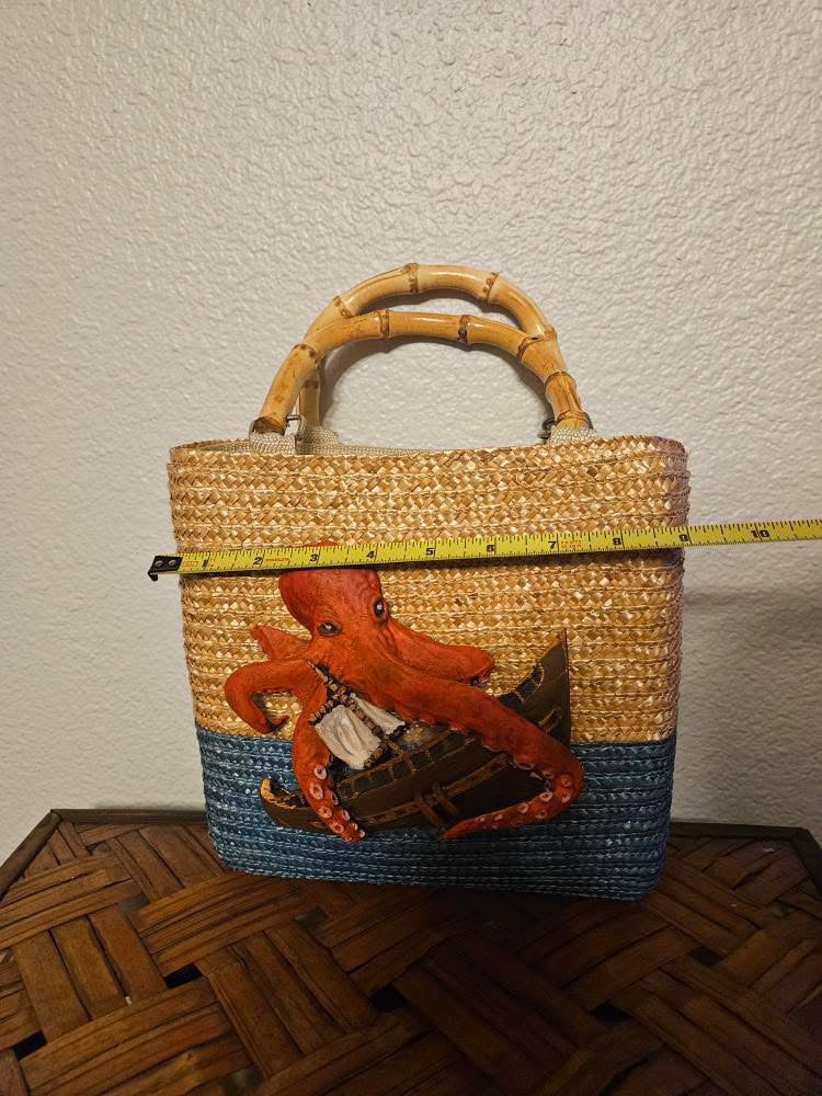 Make waves with the Kraken Attack Purse. Handmade straw tote with a 3D octopus and shipwreck design—perfect statement handbag for tiki lovers and nautical fashion fans.